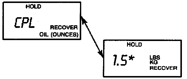 12. At the end of the initial recovery process, the display shows "CPL" and then alternately flashes the weight of refrigerant recovered and "OIL/OZ."("OIL/GMS").