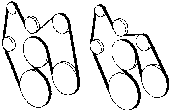 1. Route the drive belt over all of the pulleys except the tensioner. Use a 1/2 inch breaker bar with a socket placed on the tensioner pulley axis bolt and rotate the tensioner to the left (counterclockwise).