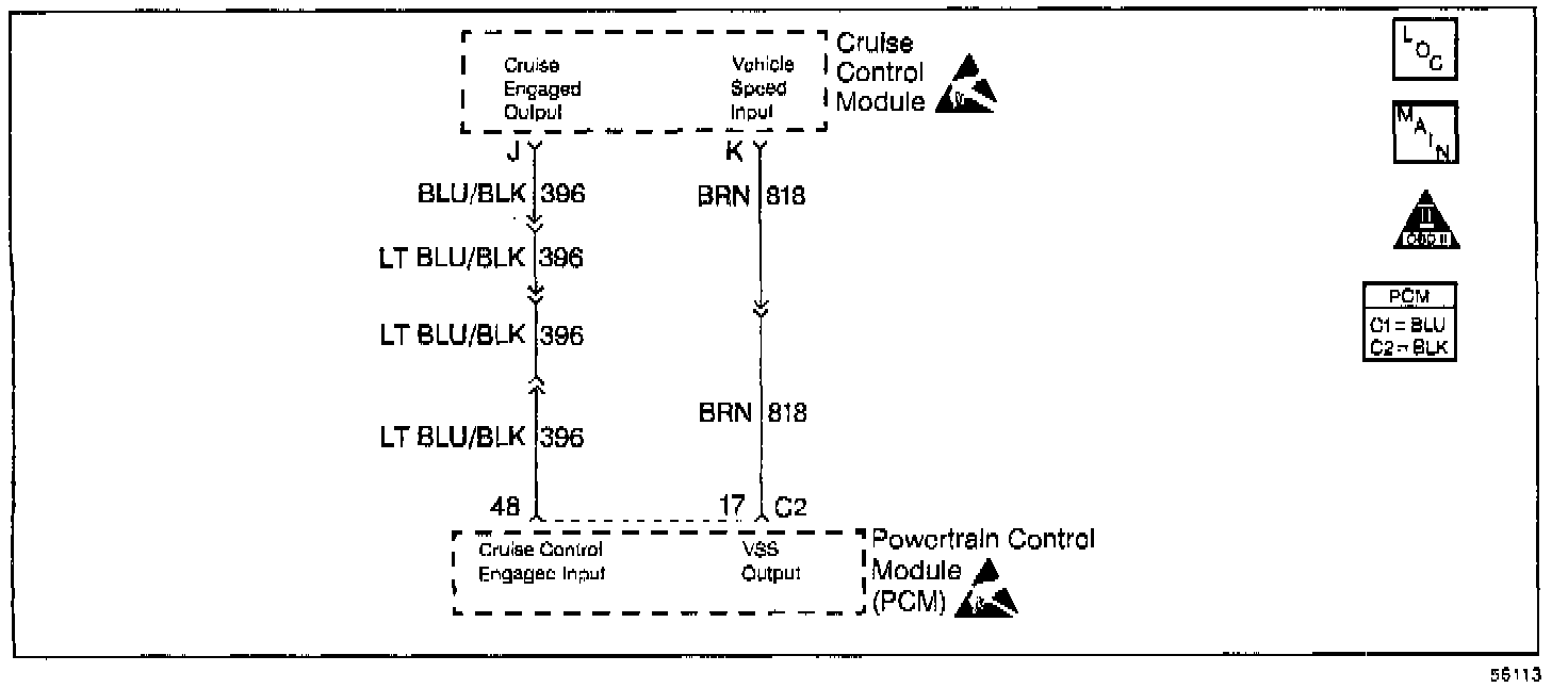 The stepper motor cruise module communicates with the PCM over three circuits (cruise engaged, cruise disabled and Vehicle Speed Sensor output). The cruise enable status tells the PCM if the cruise control system is enabled. The Vehicle Speed Sensor (VSS) output is the speed signal from the vehicle speed sensor through the PCM and used by the cruise control module. The cruise disable line allows the PCM to disable cruise under the various conditions described below: