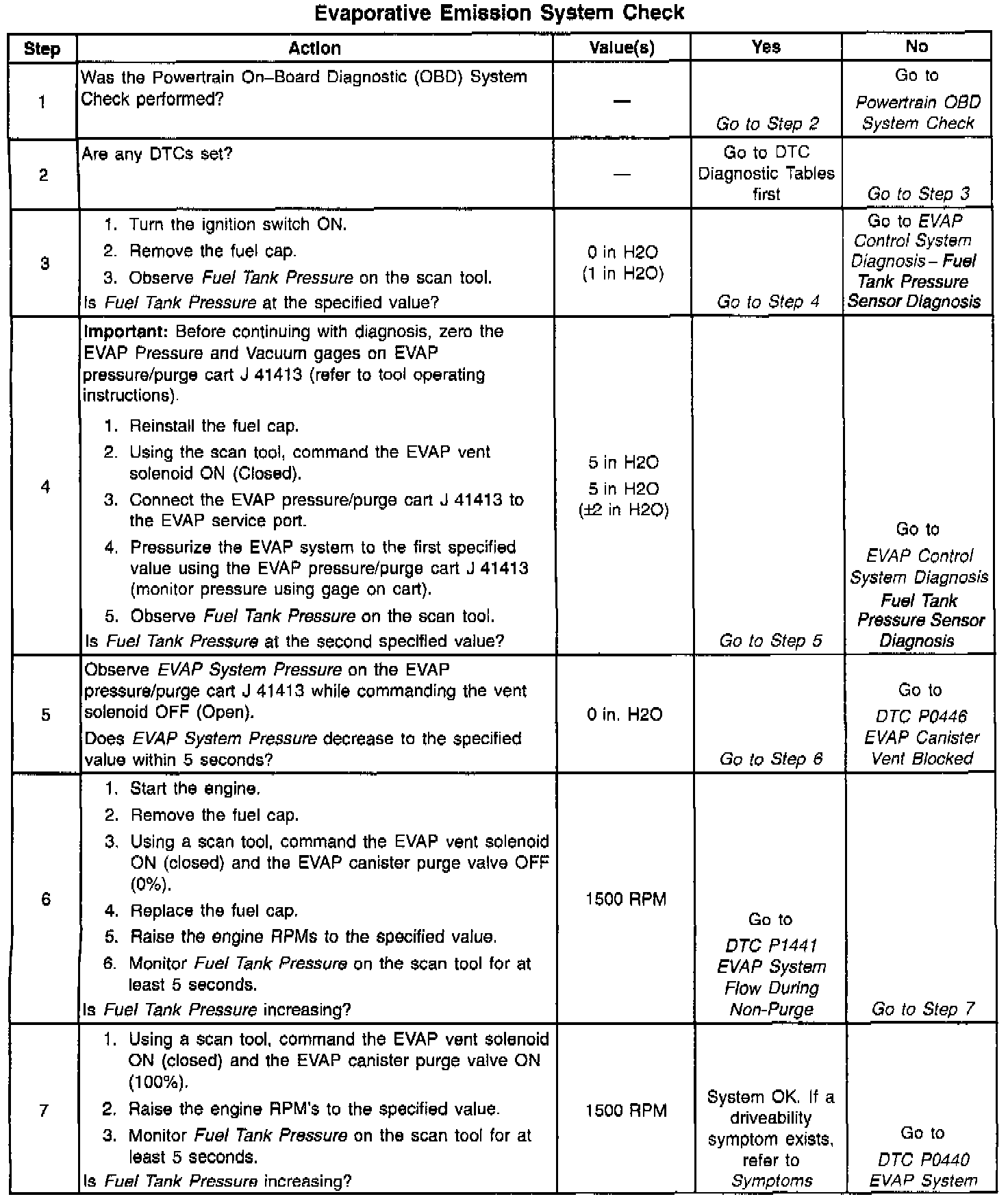 Applying a vacuum to the EVAP system and monitoring for a vacuum decay checks the evaporative emission system. The Control Module monitors the vacuum level through the fuel tank vacuum sensor signal. At an appropriate time, the EVAP canister purge valve and the EVAP vent solenoid turn ON, allowing the engine to draw a small vacuum on the entire evaporative emission system. After the desired vacuum level has been achieved, the EVAP canister purge valve turns OFF, sealing the system. A leak is detected by monitoring for a decrease in vacuum level over a given time period, when all other variables remain constant. A leak, blockage or faulty component in the system causes a DTC to set.