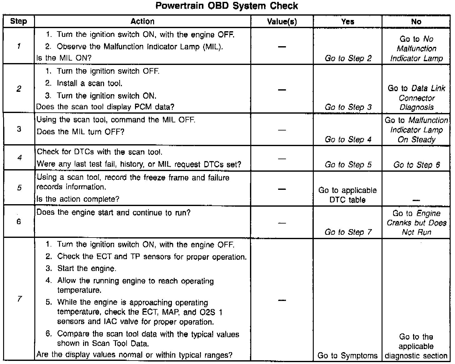 The On Board Diagnostic (OBD) System Check is an organized approach in identifying a problem created by an electronic engine system fault. The OBD system check is the starting point for any driveability diagnosis. The OBD system check directs the service technician to the next step in diagnosing the complaint. Do not perform this check if no driveability complaint exists. Understanding the table correctly reduces the diagnostic time. Understanding the table correctly prevents the replacement of good parts.