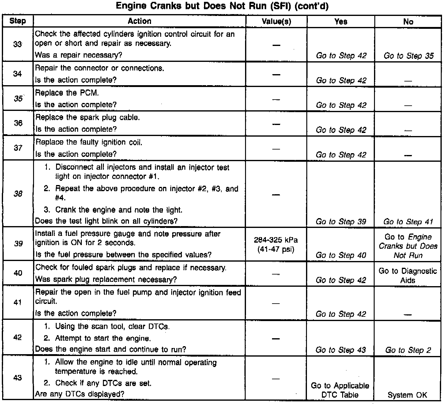 39. The fuel pump is turned ON by the PCM for 2-3 seconds after ignition is first turned ON. This step checks to see if the fuel pump and fuel pump relay are operating correctly and if the fuel pressure is within the proper range. Refer to Fuel System Diagnosis for fuel pressure gage installation procedure. System Diagnosis - Fuel System