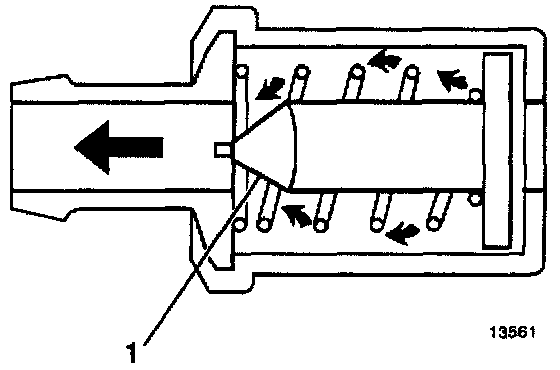 To Maintain idle quality, the valve (1) restricts the flow when intake manifold vacuum is high. Whenever abnormal operating condition arise, the system allows excessive amounts of blow-by gases to back flow through the crankcase vent tube into the rear air duct to be consumed by normal combustion