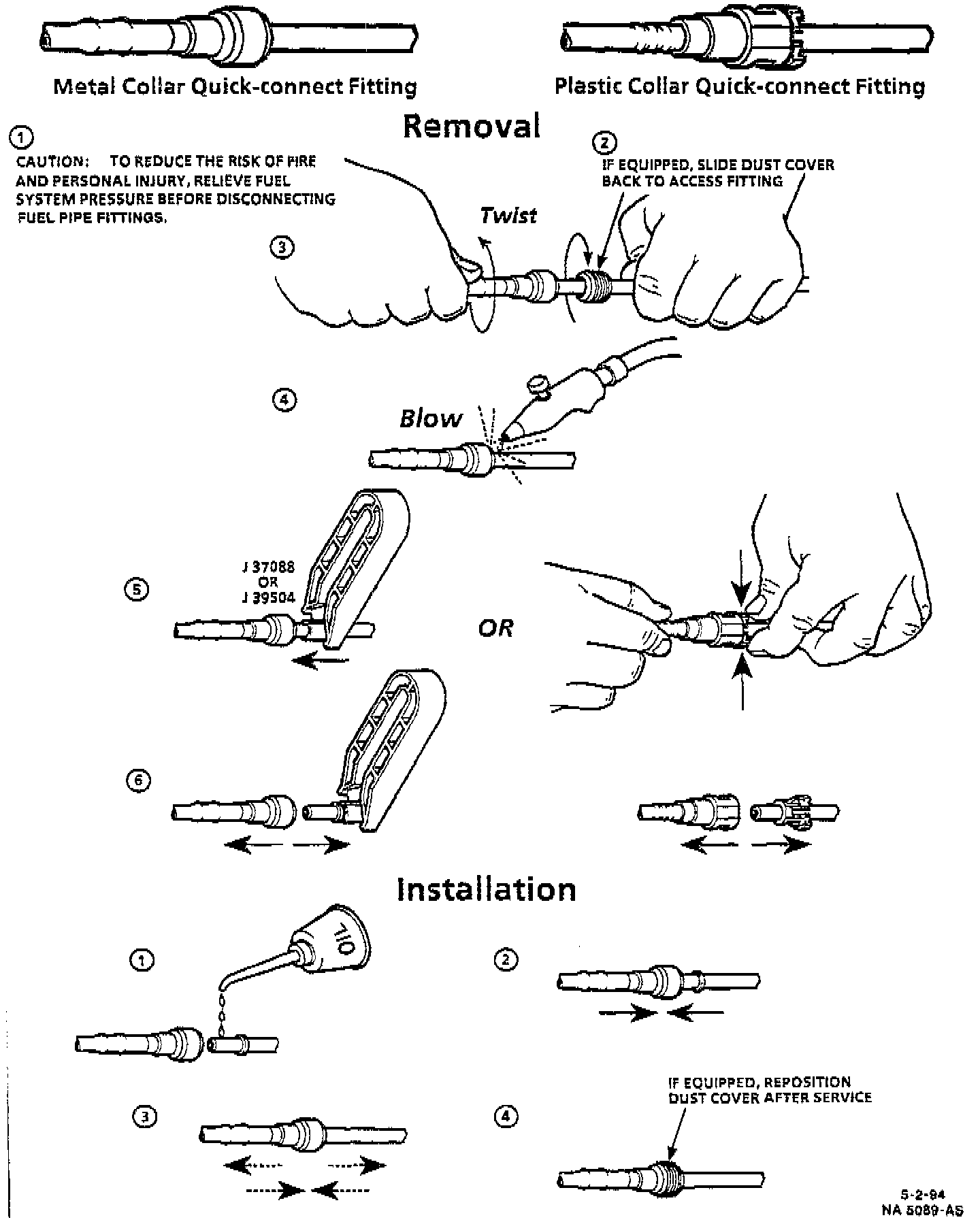 Caution: To Reduce the Risk of Fire and Personal Injury. Before connecting the fitting, always apply a few drops of clean engine oil to the male pipe end. This will ensure proper reconnection and prevent a possible fuel leak (During normal operation, the O-rings located in the female connector will swell and may prevent proper reconnection if not lubricated.
