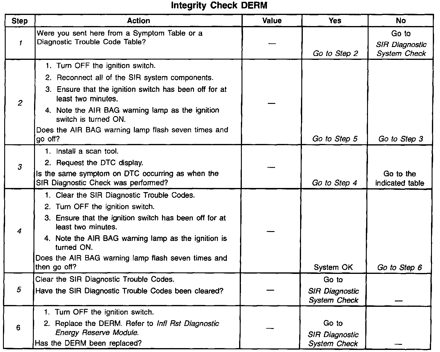 5. The symptom or DTC is no longer occurring. The condition may be intermittent or was inadvertently repaired during diagnosis of the SIR system. Refer to Intermittents and Poor Connections.
