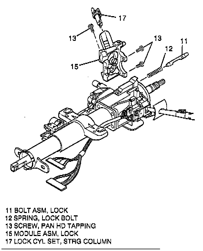 CAUTION: Lock bolt assembly (11) is under slight spring tension from lock bolt spring (12). Hold lock bolt (11) in place while removing lock module assembly (15).