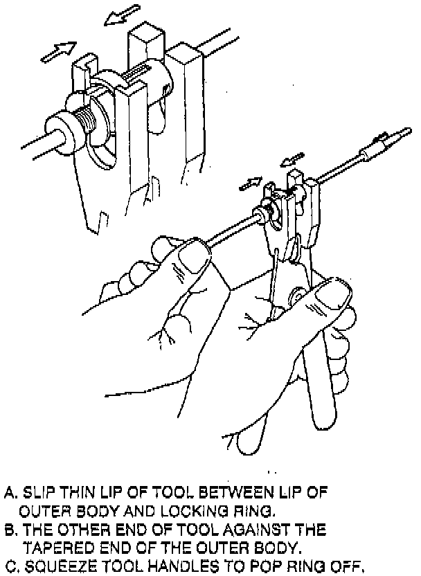 - Insert small blade screwdriver into slot in module assembly (IS). Push against locking tab on end of cable assembly (48) and remove.