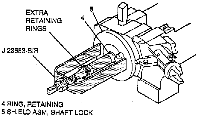 5. New shaft lock retaining ring (4) using J 23653-SIR to push down shaft lock shield assembly (5).