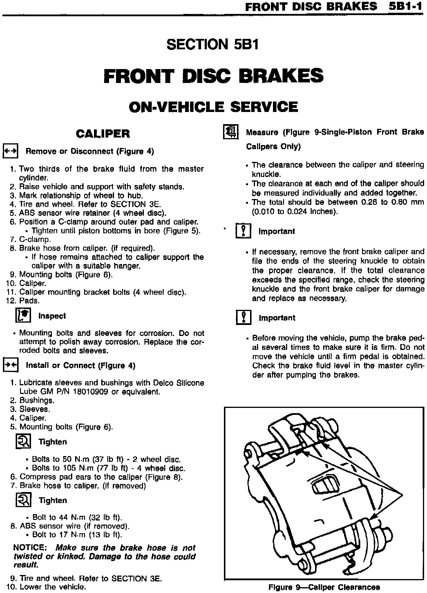 Section 5B1 - Front Disc Brakes - Revised Procedure and Specifications for Clearance Between Caliper and Steering Knuckle