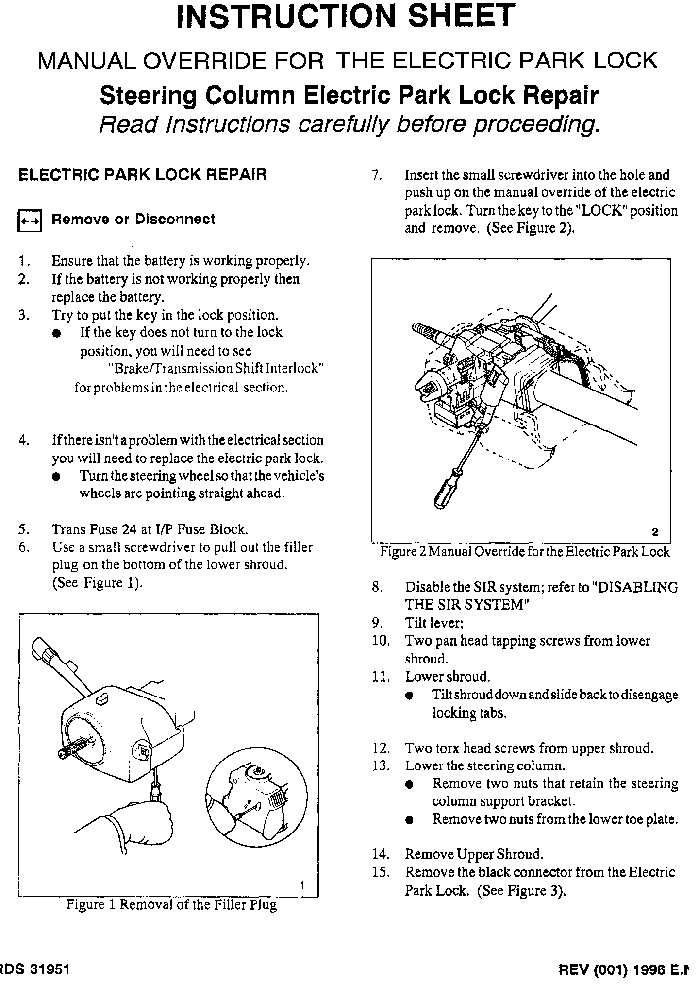 1.1 1996 Book 1 Section 3F4, Standard Steering Column Unit Repair is revised to add the Instruction Sheet: Manual Override For The Electric Park Lock Repair.