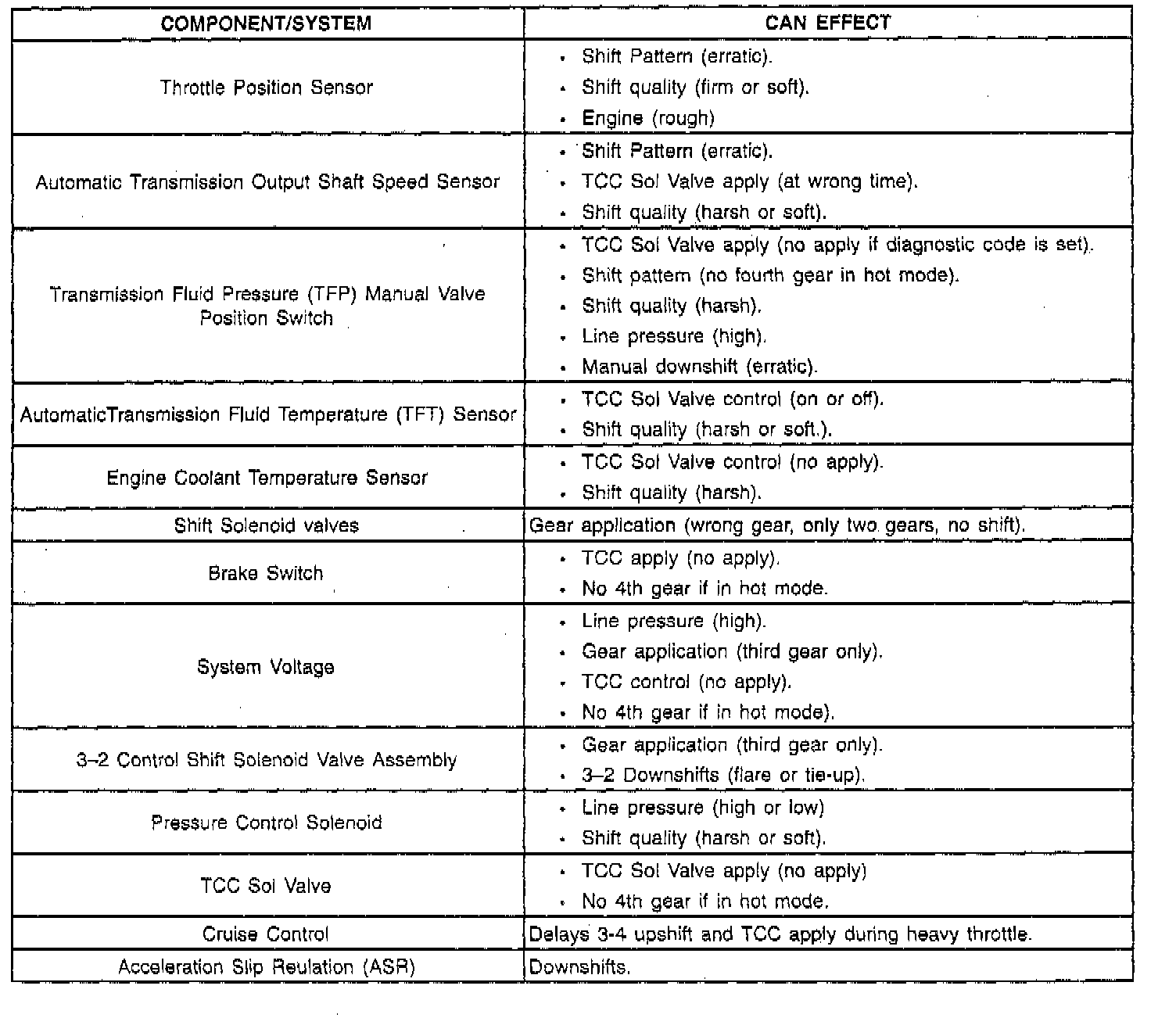 This table gives some general information about electronic component malfunctions. Use this information to become familiar with possible conditions caused by transmission/vehicle electrical components. Refer to the DIAGNOSIS TABLES for more specific information.