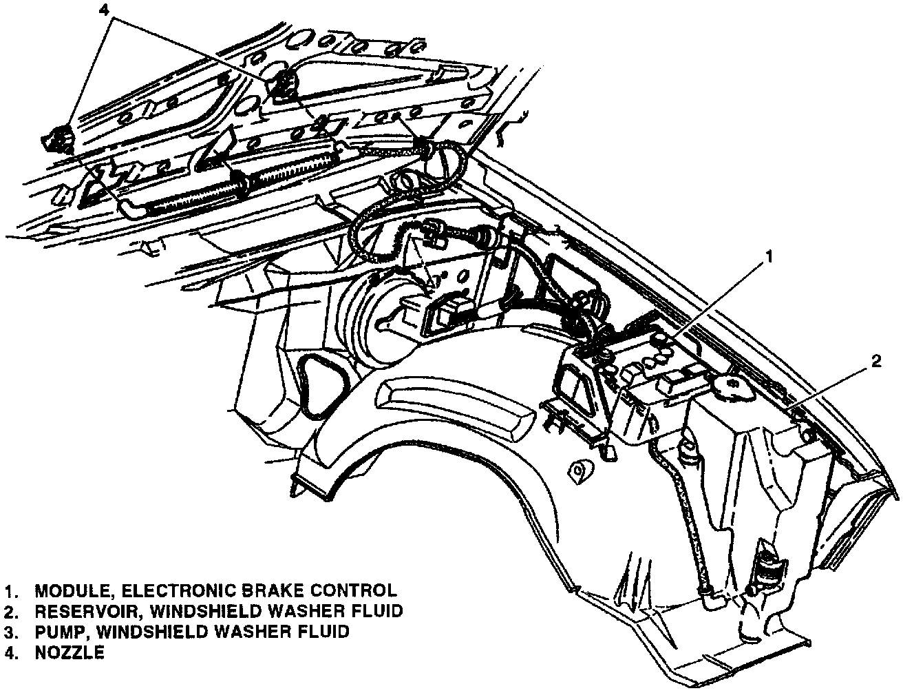 Washer hose routing begins at two hood-mounted nozzles. The one-piece washer hose clips to the inside of the hood and left side of the brake booster flange. Solvent passes through a strainer assembly near where the left fender and cowl join. Routing continues along the left fender then terminates at the washer solvent container.