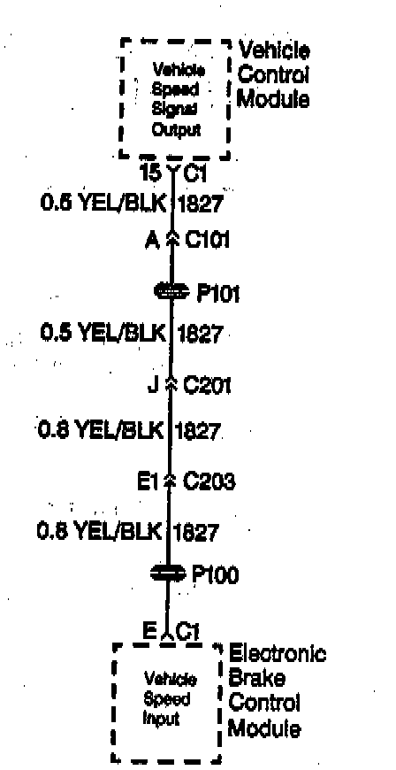 The rear wheel speed signal originates from the Vehicle Speed Sensor (VSS) which is connected to the Vehicle Control Module (VCM). The Electronic Brake Control Module (EBCM) receives the rear wheel speed signal from the VCM.