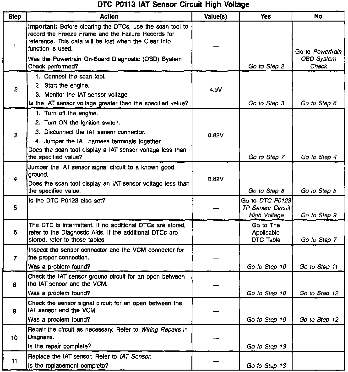 2. If the IAT sensor circuit voltage measures greater than 4.9 volts, the conditions for the DTC are still present, and the problem is not intermittent.