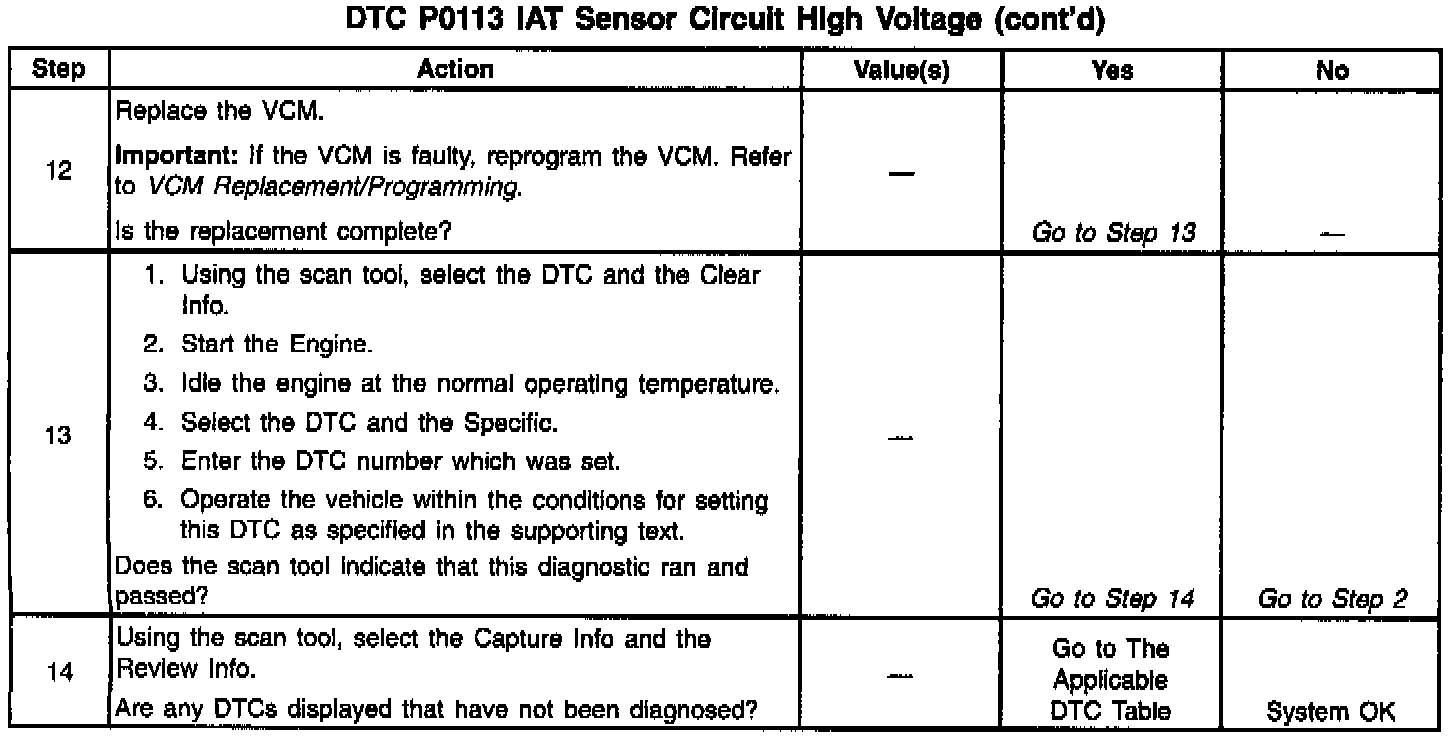 The Intake Air Temperature (IAT) sensor is a thermistor located in the fresh air duct to the throttle body in order to monitor the temperature of the air entering the throttle body. The VCM applies 5 volts to the sensor on 5 volt reference circuit. When the air is cool, the resistance in the sensor measures high and the VCM senses a high voltage signal. If the air is warm, the sensor resistance measures low and the VCM senses a low voltage signal. This DTC is a type A DTC.