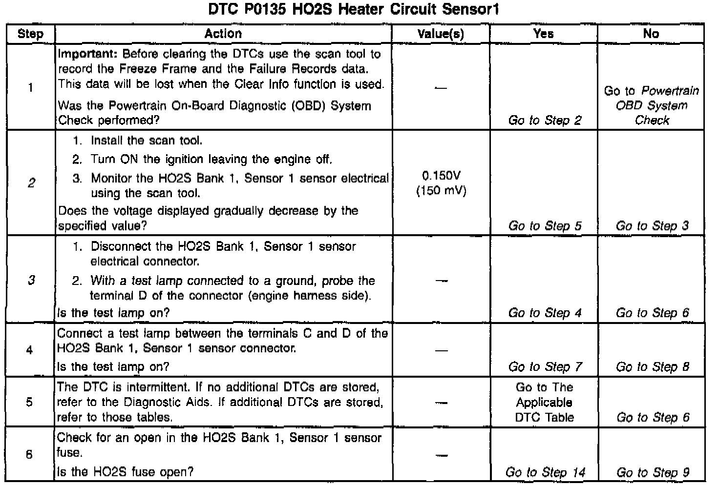 2. This step determines if the DTC P0135 is the result of a hard failure or an intermittent condition present. With the ignition ON and the engine off, the HO2S Bank 1, Sensor 1 voltage displayed on the scan tool should gradually change to 0.150 volt, indicating that the heater is working properly. The HO2S voltage can rise as high as 975 mV before it toggles back down. The main thing to look for is a change.