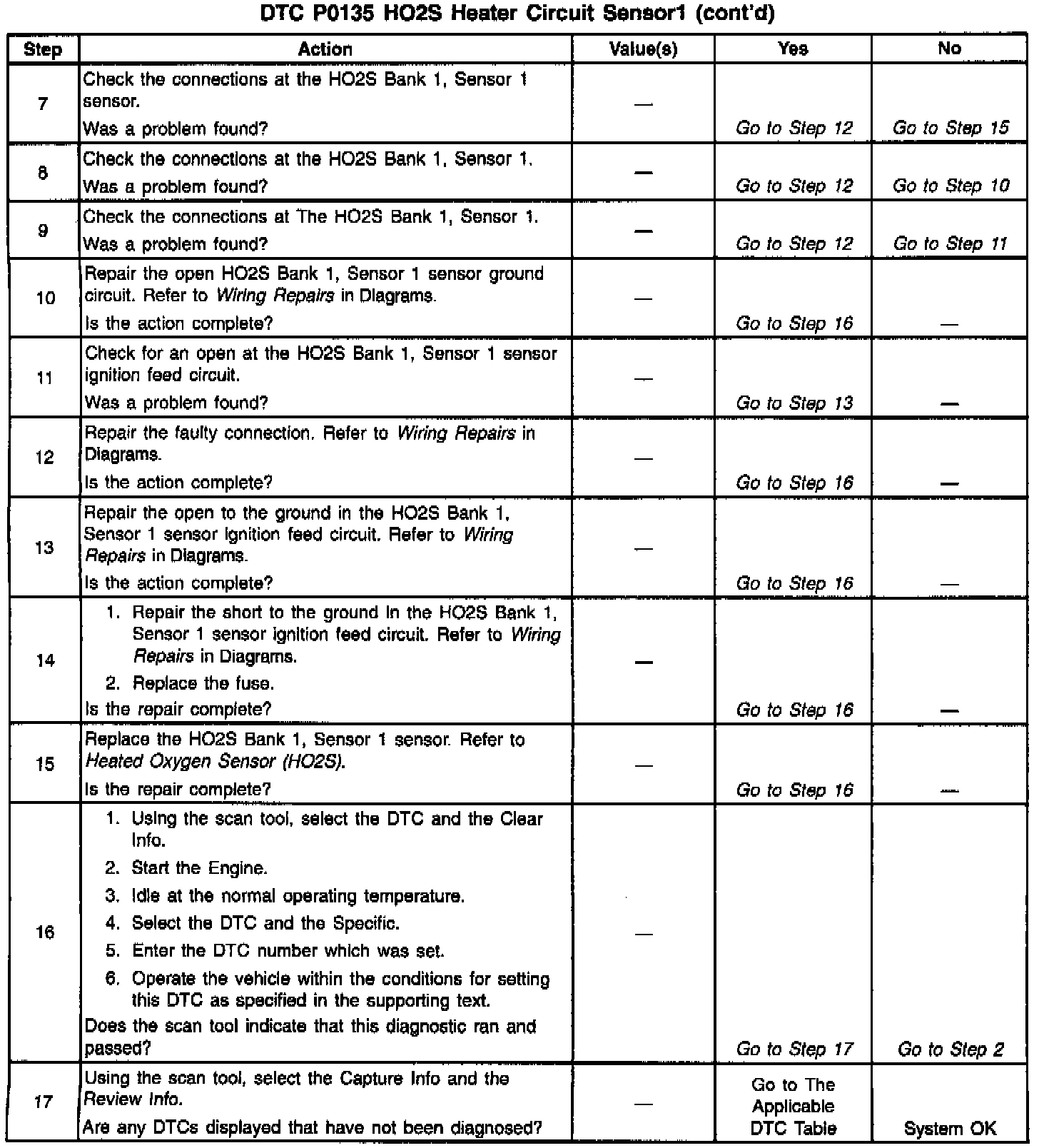 The numbers below refer to the step numbers on the diagnostic table.