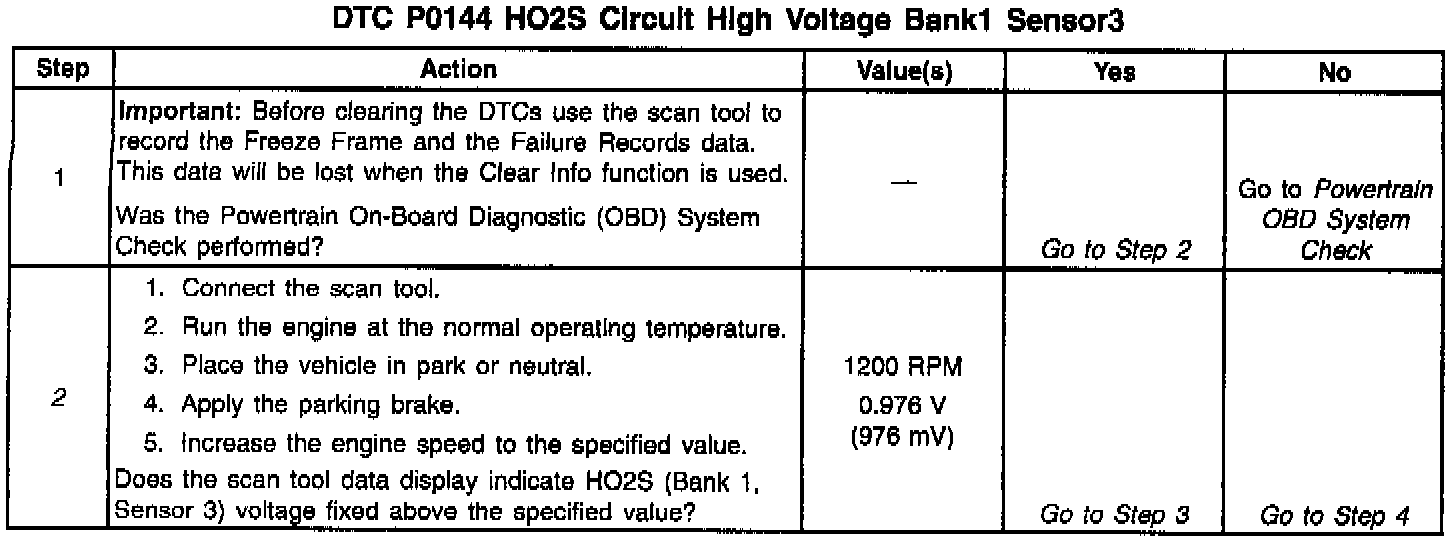 The sensor is like an open circuit and produces no voltage when it is below about 360°C (600°F). The P0144 determines if the HO2S or the circuit is shorted to high by checking for a rich condition during steady throttle and Decel fuel cutoff (DFCO). This DTC is a type B DTC.