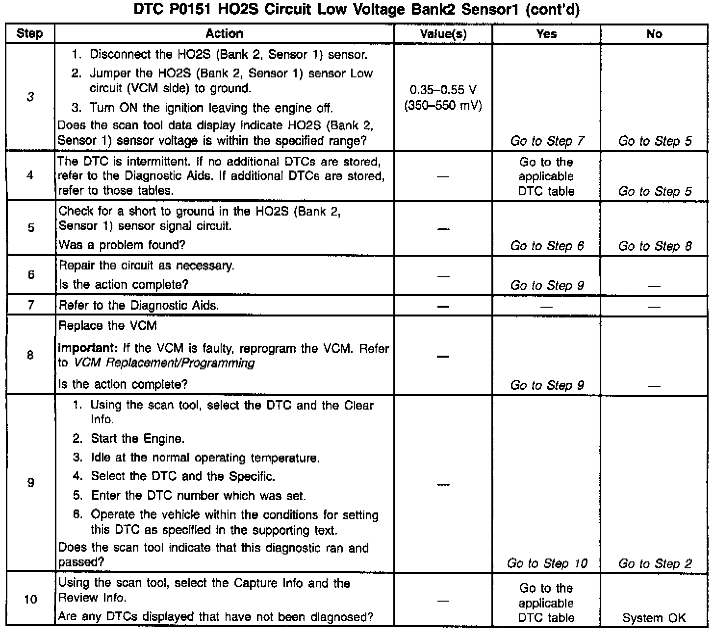 The VCM supplies a voltage of about 0.45 volt (450 mV) between the HO2S High and HO2S Low circuits. (It measured with a megohm digital voltmeter, this may read as low as 0.32 volt.) The Heated Oxygen Sensor (HO2S Bank 2 Sensor 1) varies the voltage within the range of about 1.0 volt (1000 mV) if the exhaust is rich, down to about 0.10 volt (100 mV) if the exhaust is lean. The DTC P0151 is a type A DTC.