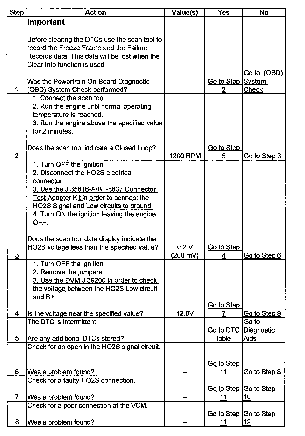 The VCM supplies a voltage of about 0.45 volt between the HO2S High and the HO2S Low circuits. (It measured with a 10 megohm digital voltmeter, this may read as low as 0.3 volt.) The Heated Oxygen Sensor (HO2S Bank 2, Sensor 1) varies the voltage within a range of about 1.0 volt if the exhaust is rich, down through about 0.1 volt if the exhaust is lean. The sensor is like an open circuit and produces no voltage when it is below 360°C (600°F).