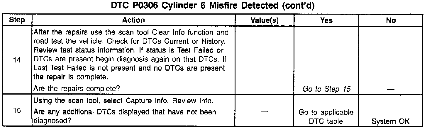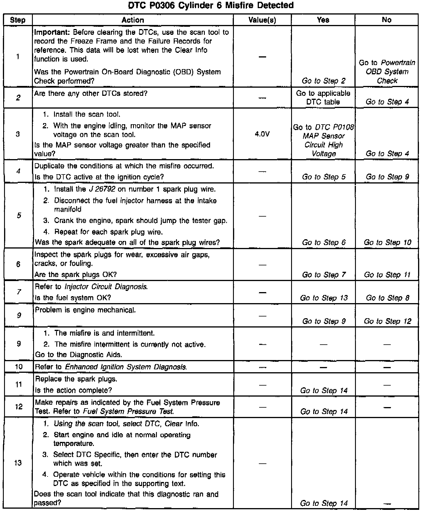 The crankshaft position sensor and camshaft position sensor detects a misfire. The VCM monitors the speed of the crankshaft. The VCM detects a deceleration of the crankshaft that is not associated with normal engine speed reduction. In order to determine if a misfire occurred, the VCM compares the deceleration information to the engine speed and engine load. If a misfire event is determined, the VCM compares the crankshaft position to the cam sensor signal in order to determine which cylinder misfired. The VCM stores the information in separate accumulators for each cylinder. Upon completion (or failure) of the test, the VCM evaluates the number of misfires in each accumulator. If the accumulators are somewhat even or if 3 or more cylinders are misfiring, then this determines that a random misfire has occurred. The VCM also utilizes the input from the ABS wheel speed sensor in order to determine if a rough road condition exists which could cause a crankshaft acceleration and deceleration. If a rough road condition exists, the diagnostic will not run. This DTC is a type B DTC.