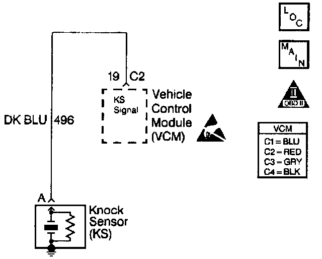 The VCM uses the Knock Sensors in order to detect engine detonation. This detection allows the VCM to retard the Ignition Control (IC) spark timing based on the Knock Sensor (KS) signal the VCM receives. The circuitry within the knock sensor pulls down the VCM-supplied 5 volt signal, so that under a no knock condition the signal on the KS circuit measures about 1.3 volts. The knock sensors produce an IAC signal that rides on the 1.3 volts DC. The signal amplitude and frequency are dependent upon the amount of the knock being experienced.