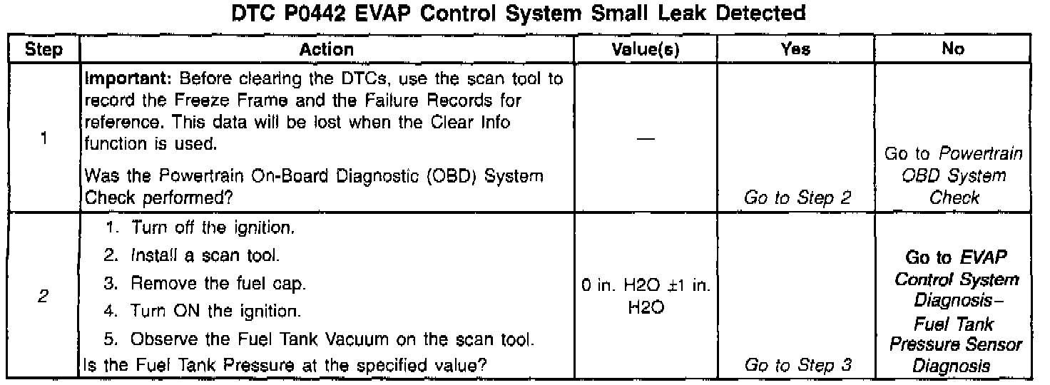 The evaporative leak detection diagnostic strategy is based on applying a vacuum to the EVAP system and monitoring the vacuum decay. The VCM monitors vacuum level via the fuel tank vacuum sensor input. At an appropriate time, the EVAP purge solenoid and the EVAP vent solenoid are turned on, allowing the engine vacuum to draw a small vacuum on the entire evaporative emission system. After the desired vacuum level has been achieved, the EVAP purge solenoid turns OFF sealing the system. A leak is detected by monitoring for a decrease in the vacuum level over a given time period with all other variables remaining constant. A small leak in the system will cause DTC P0442 to be set. This DTC is a Type A DTC.