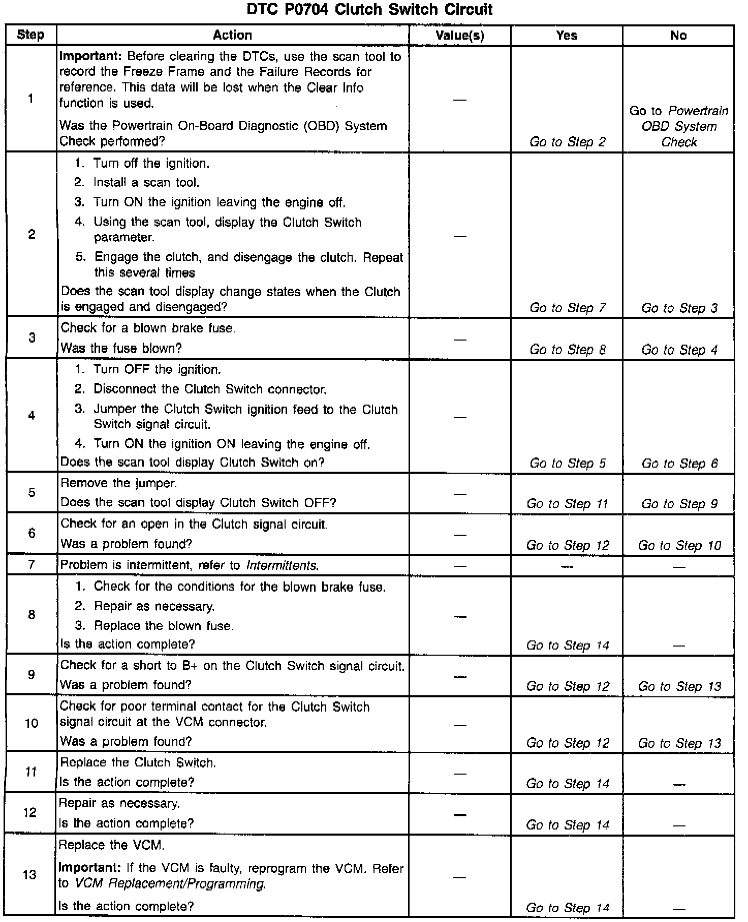 This DTC determines it the Transmission Clutch Switch has failed by looking for a clutch switch transition within a range from 0 mph to some higher speed. This DTC is a type B DTC.
