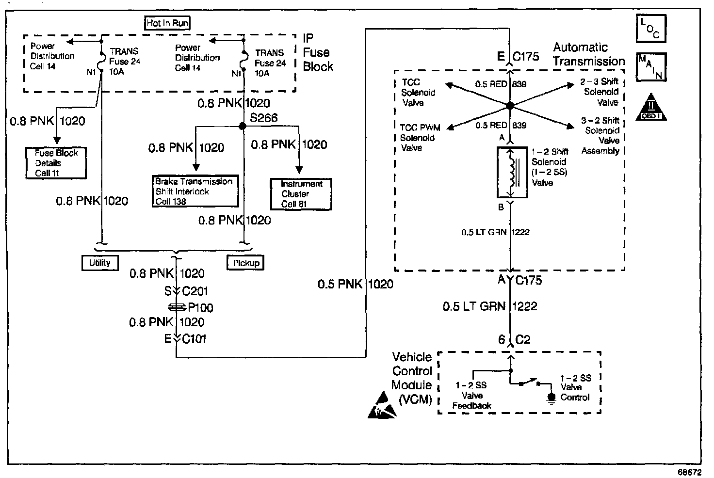The 1-2 Shift Solenoid Valve (1-2 SS Valve) controls the fluid flow acting on the 1-2 and 3-4 shift valves. The solenoid is a normally-open exhaust valve. With the 2-3 Shift Solenoid Valve (2-3 SS Valve), the 1-2 SS Valve allows four different shifting combinations. The solenoid attaches to the control valve body within the transmission. The 1-2 SS Valve receives ignition voltage through circuit 1020. The VCM controls the solenoid by providing the ground path on circuit 1222.