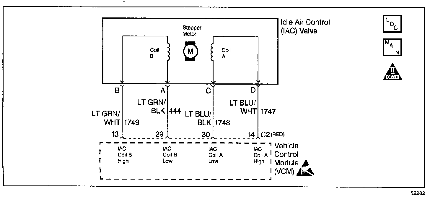 The VCM controls idle speed with an Idle Air Control (IAC) valve to a calculated desired RPM based on sensor inputs and actual engine RPM. The VCM uses 4 circuits to move an Idle Air Control (IAC) valve, allowing varying amounts of air flow into the intake manifold. In order to increase idle RPM, the VCM moves the IAC valve out, allowing more air to bypass the throttle plate. In order to decrease RPM, the VCM will move the IAC valve in, reducing the amount of air bypassing the throttle plate. A scan tool reads the VCM commands to the IAC valve in counts. The higher the counts, the more air that is allowed to bypass the throttle plate (higher idle). The lower the counts, the less air that is allowed to bypass the throttle plates (lower idle). This is a type B DTC.