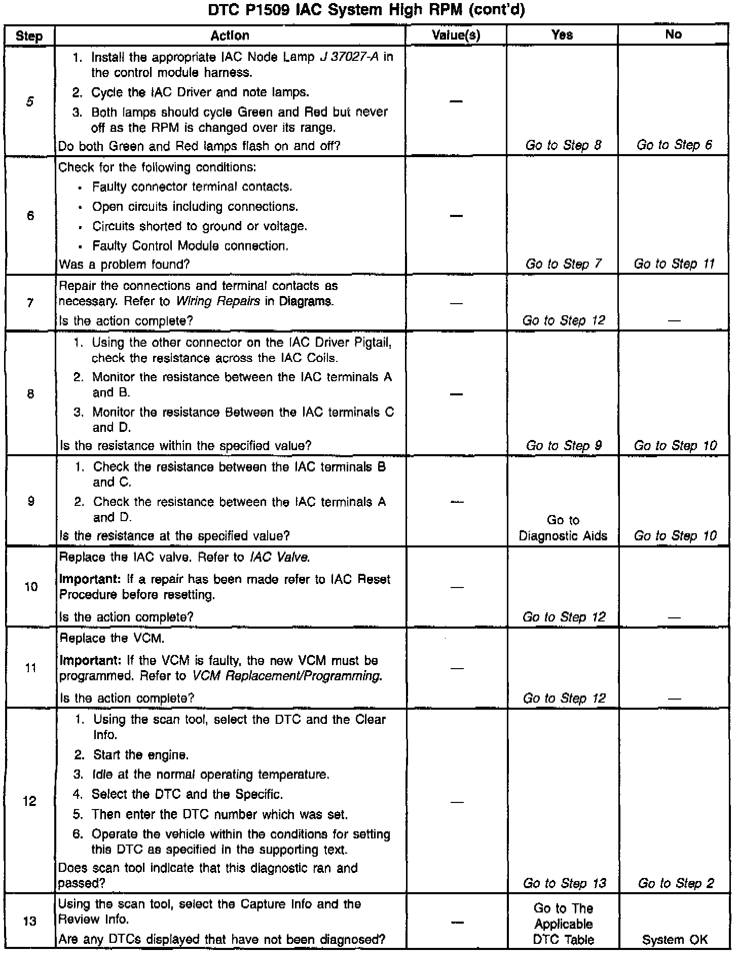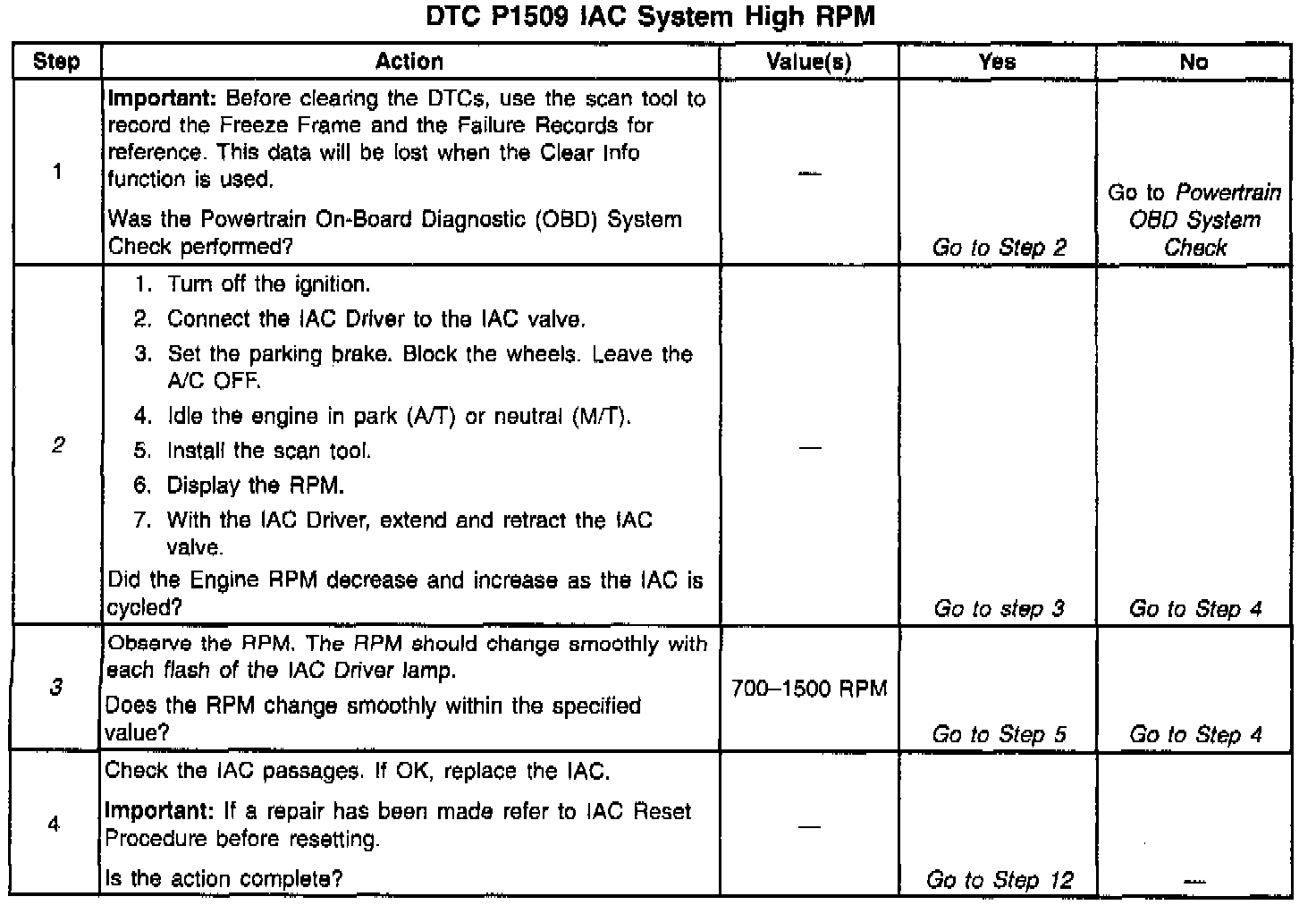 3. This step checks the quality of the IAC movement in Step 2. Between 700 RPM and about 1200 RPM, the engine speed should change smoothly with each flash of the tester lamp in both extend and retract. If the IAC valve is retracted beyond the control range (about 1500 RPM), it may take many flashes in the extend position before engine speed will begin to drop. This is normal on certain engines, fully extending IAC may cause engine stall. This may be normal.