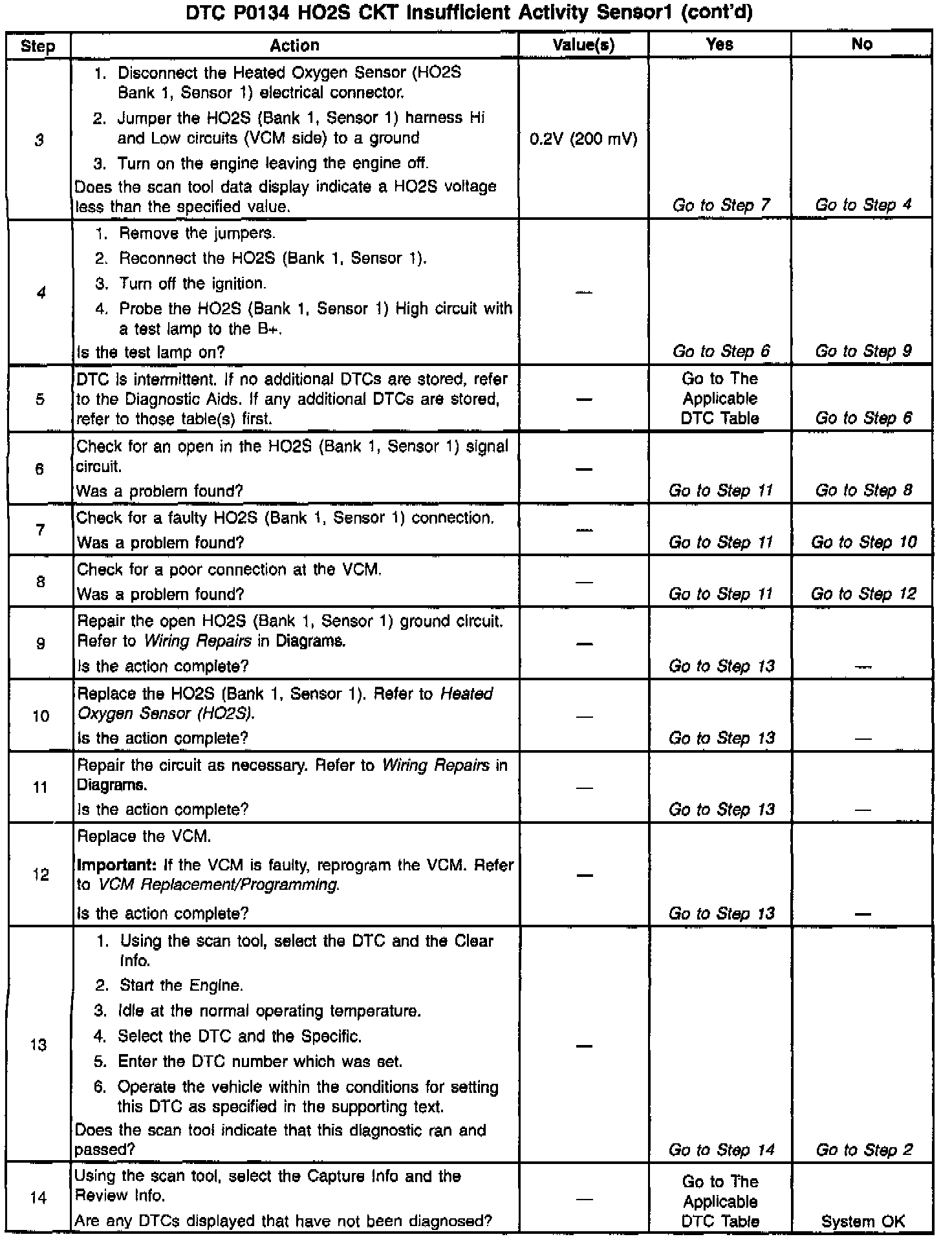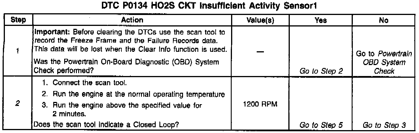 The sensor is like an open circuit and produces no voltage when it is below 360°C (600°F). An open oxygen sensor circuit or cold oxygen sensor causes an Open Loop operation. The HO2S heater provides for a taster sensor warm-up which allows the sensor to become active in a shorter period of time and remain active during a long extended idle. The DTC P0134 determines if the HO2S at the HO2S circuit has developed an open. This DTC is a type A DTC.