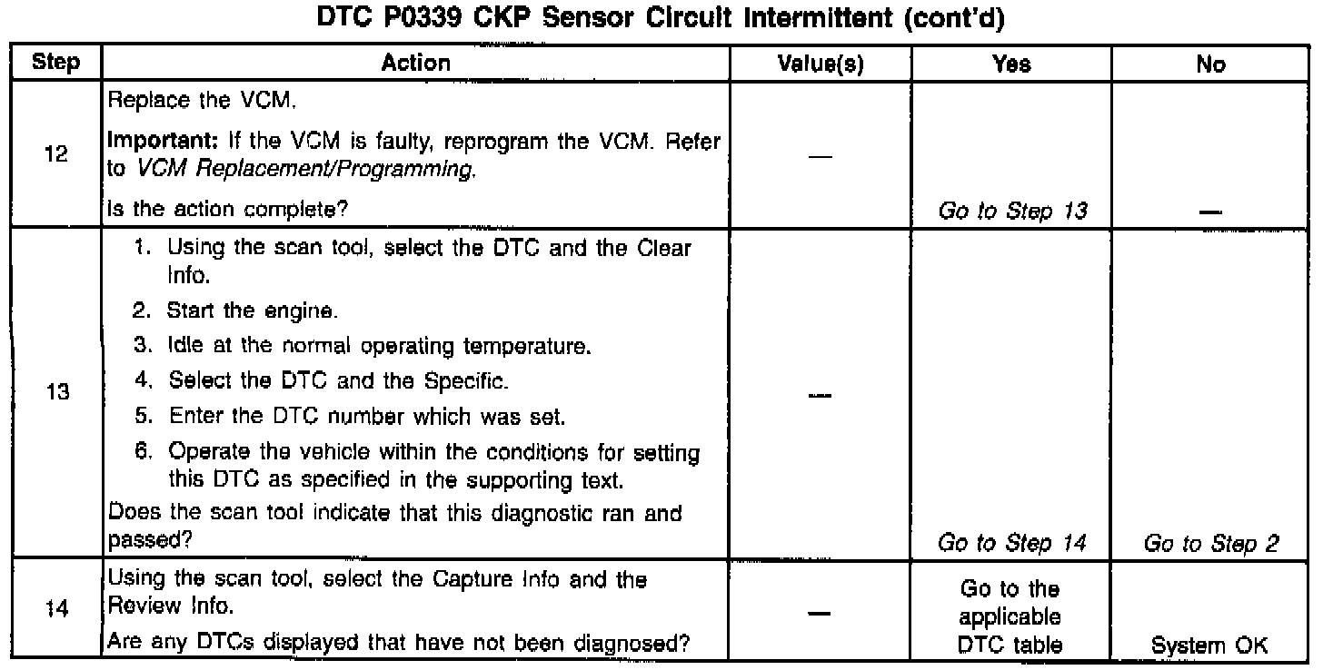 The Crankshaft Position (CKP) sensor sends a reference signal to the Vehicle Control Module (VCM) in order to indicate the crankshaft position and RPM. The VCM uses this information in order to determine when to pulse the ignition coil, the fuel injectors and the control ignition timing. The DTC P0339 is a type B DTC.