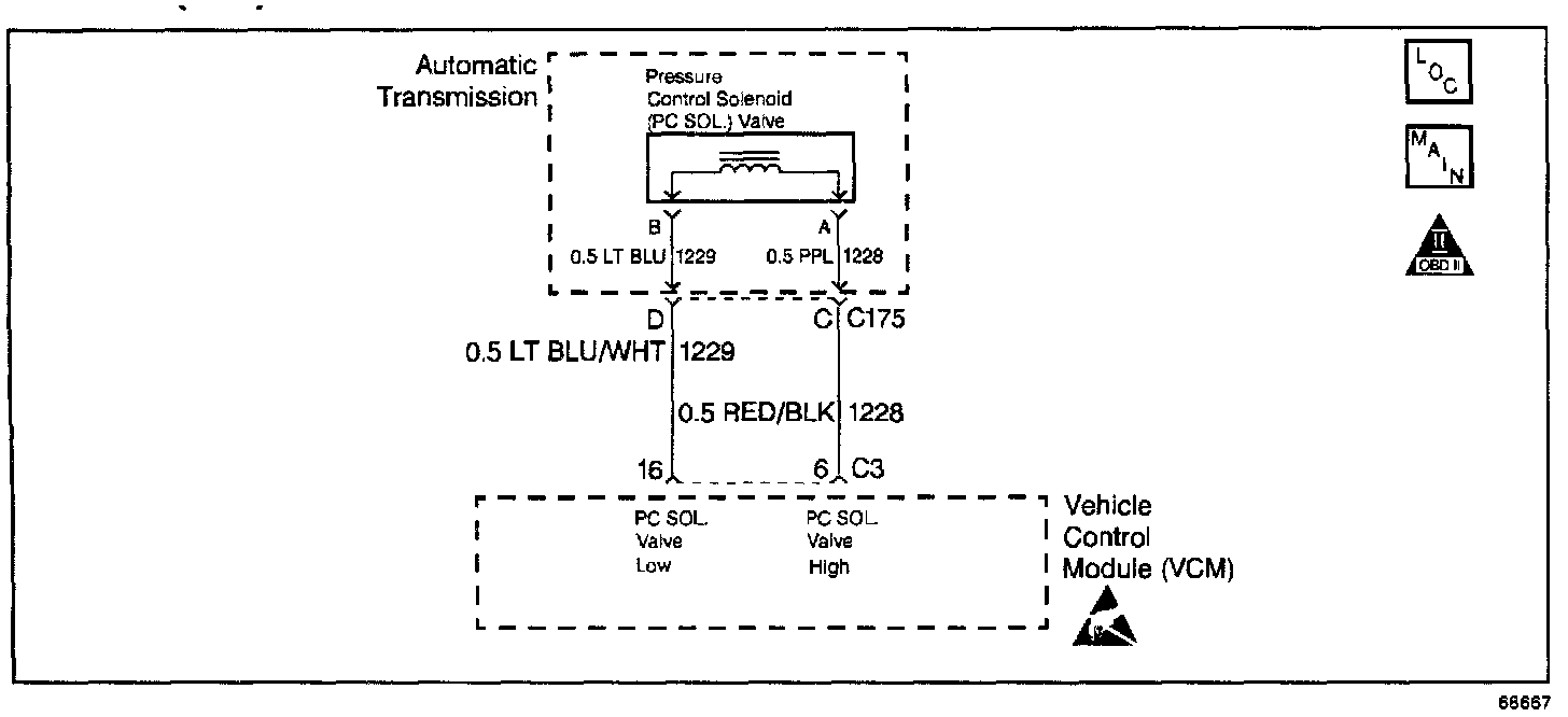 The Pressure Control Solenoid Valve (PC Sol. Valve) is a VCM-controlled device used to regulate the transmission line pressure. The VCM compares the Throttle Position (TP) voltage, the engine RPM and other inputs to determine the line pressure appropriate for a given load. The VCM applies a varying amperage to the PC Sol. Valve in order to regulate the pressure. The applied amperage can vary from 0.1 to 1.1 amps. The VCM monitors the amperage.