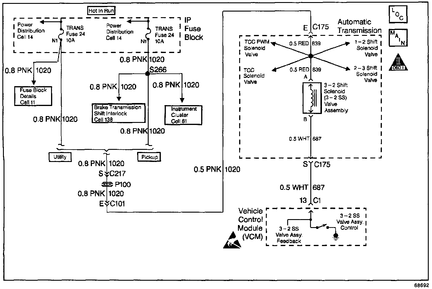 The 3-2 Shift Solenoid Valve Assembly (3-2 SS Valve Assy.) is a normally-closed, 3-port, on/off device that controls the 3-2 downshift. The solenoid attaches to the control valve body within the transmission. The solenoid receives ignition voltage through circuit 1020. The VCM controls the solenoid by providing a ground path on circuit 687. During a 3-2 downshift, the 2-4 band applies as the 3-4 clutch releases. The VCM varies the timing between the 3-4 clutch release and the 2-4 band apply depending on the vehicle speed and the throttle position.