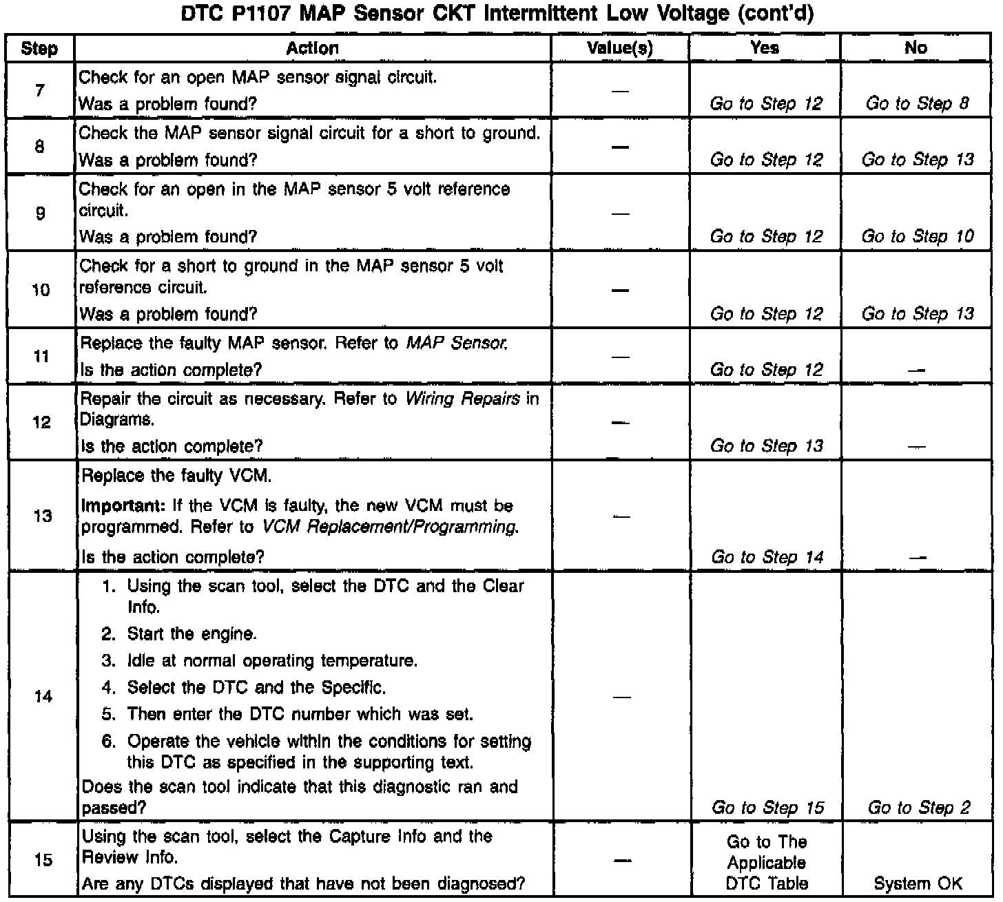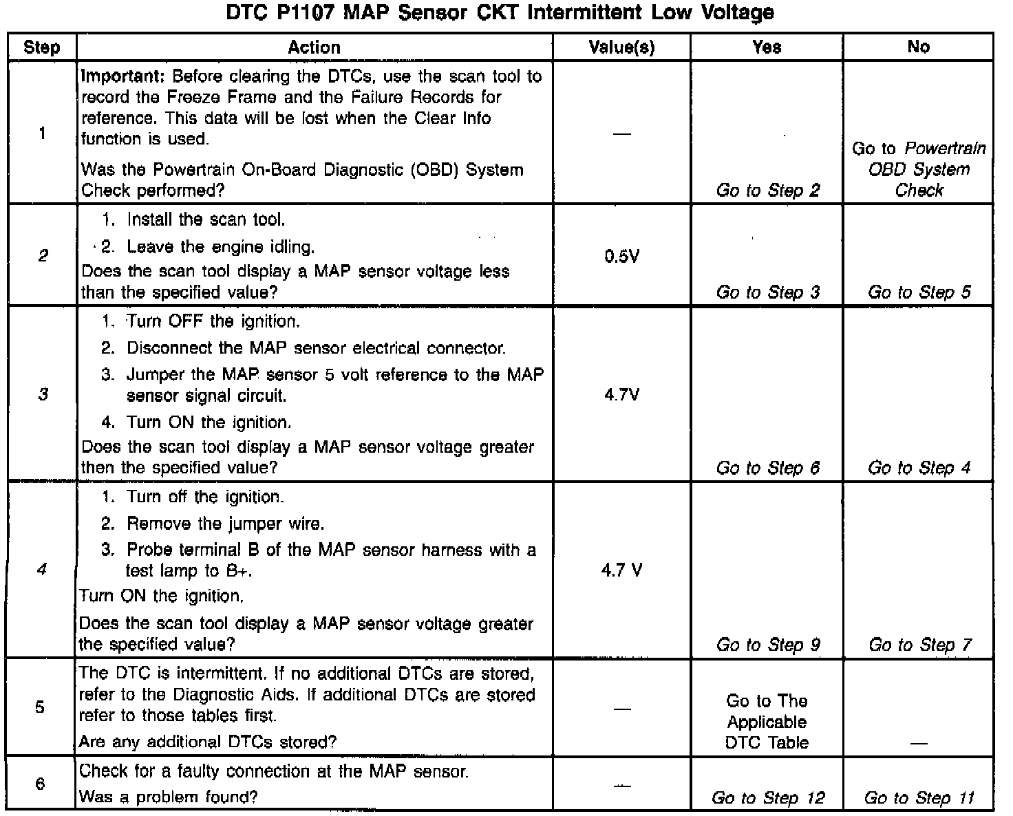 An intermittent open in the MAP sensor signal circuit or the 5 volt reference circuit will result in a DTC P1107.