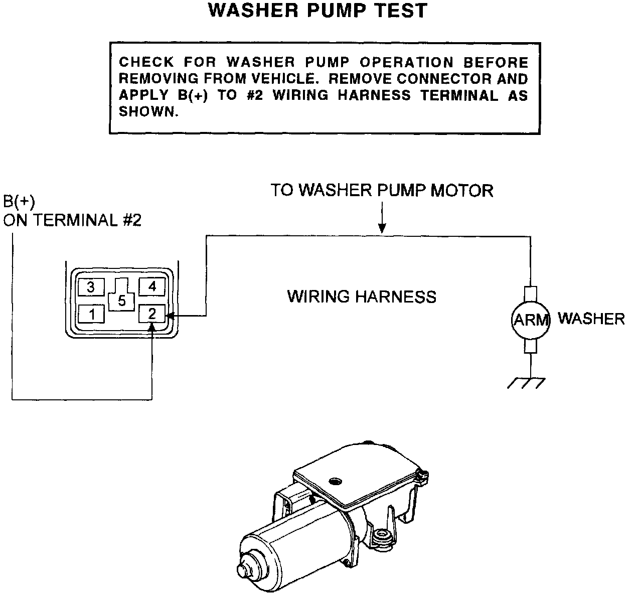 2. If motor runs and pumps solvent, problem is in circuit board, motor park switch, or wiper switch. Refer to Wiper/Washer Switch Tests.