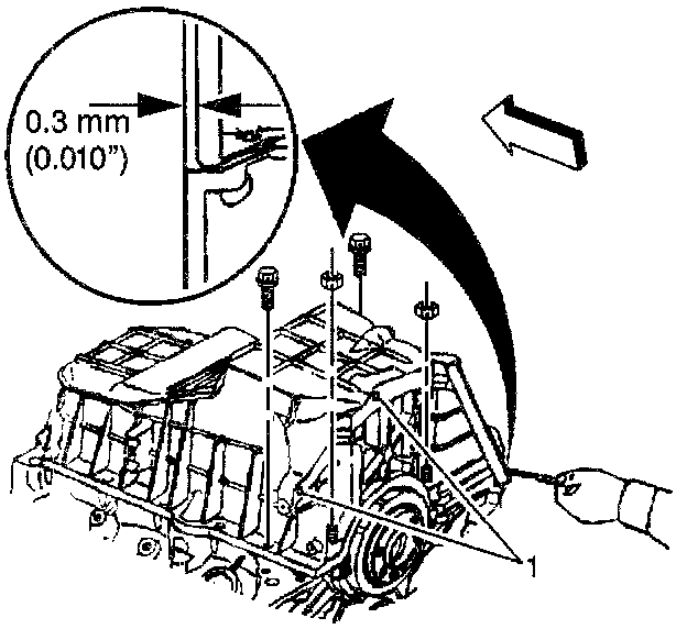 2. Use a feeler gauge to check the clearence between the three oil pan-to-transmission contact points. If the clearance exceeds 0.0254 mm (0.010 in) at any of the three points, repeat the installation steps until the clearence is within specifications.