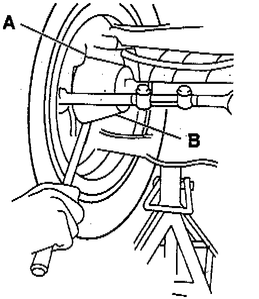 b. Pry between the (B) lower control arm and the (A) outer bearing race while reading the dial indicator. This will show vertical looseness in the ball joints.