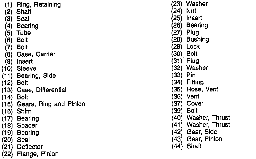 Important: It is essential that the positions of all driveline components relative to the propeller shaft and axles be observed and accurately reference marked prior to disassembly. These components include the propeller shafts, drive axles, pinion flanges, output shafts, etc. All components must be reassembled in the exact relationship to each other as they were when removed. Additionally, the published specifications and torque values, as well as any measurements made prior to disassembly must be followed.Part 1 Of 2:
