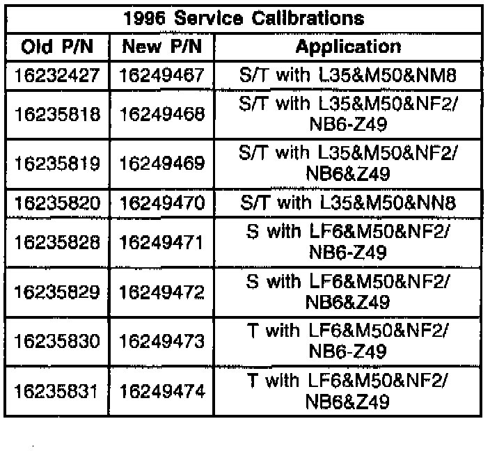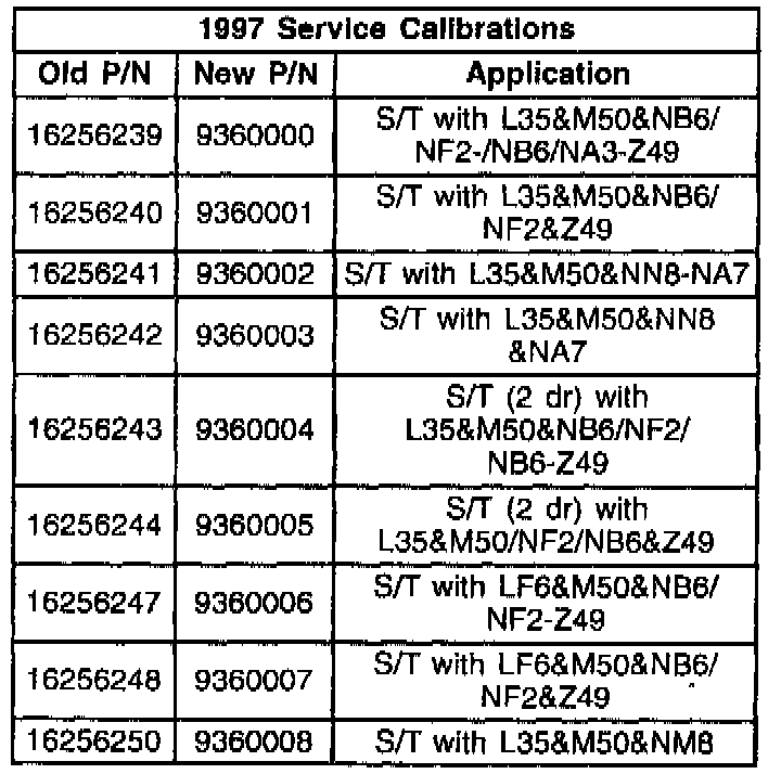 The calibrations listed are FLASH calibrations and are not available from GMSPO. These calibrations are available on 1998 Techline CD ROM Disc 07 and later.