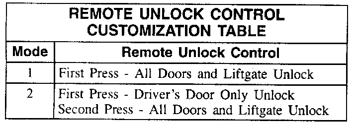 Remote Unlock Control Customization Table: