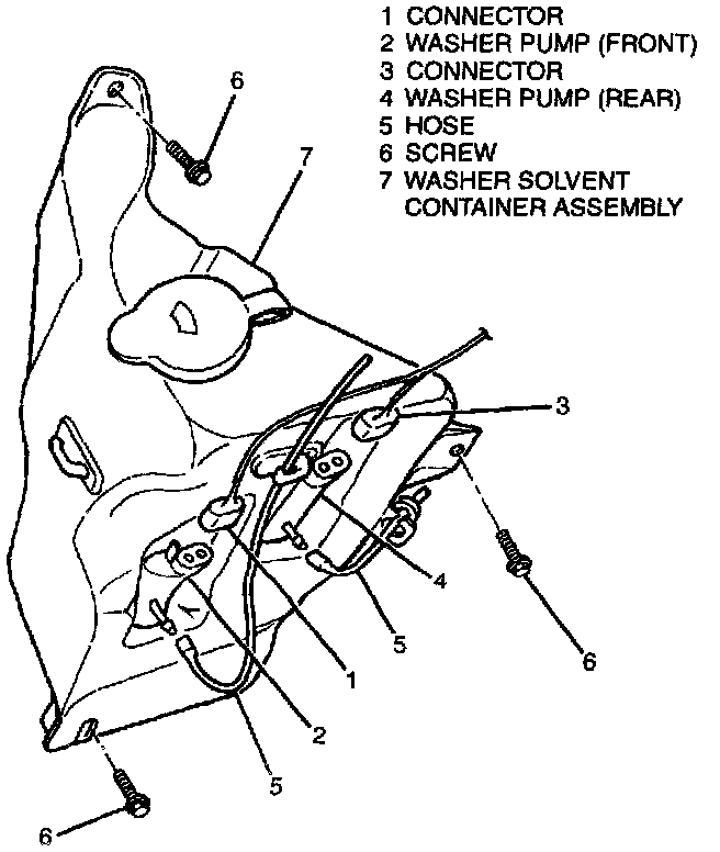 5. Two upper screws (6) from washer solvent container and vehicle.