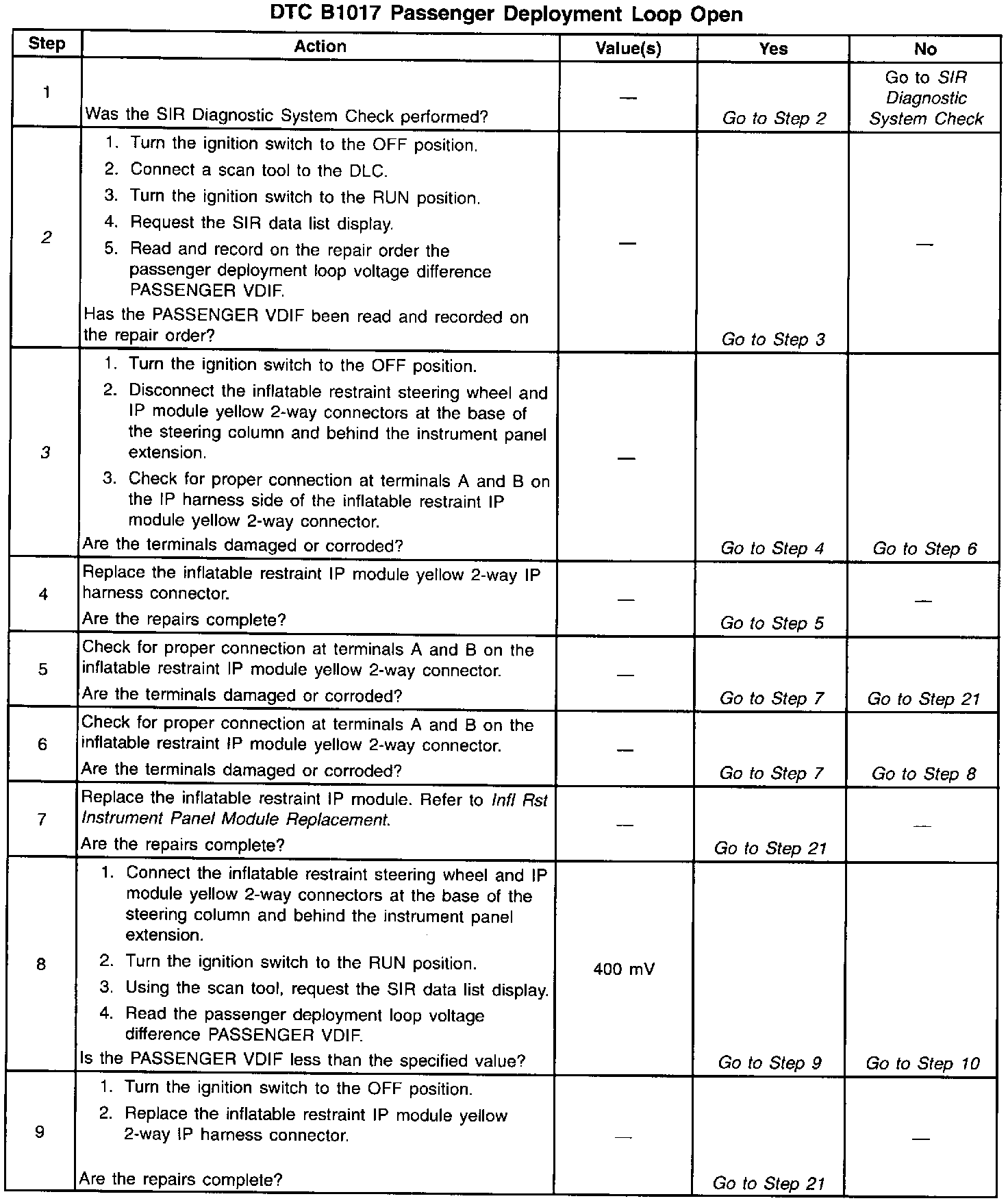 10. This test isolates the malfunction to one side of the inflatable restraint IP module yellow 2-way connector.