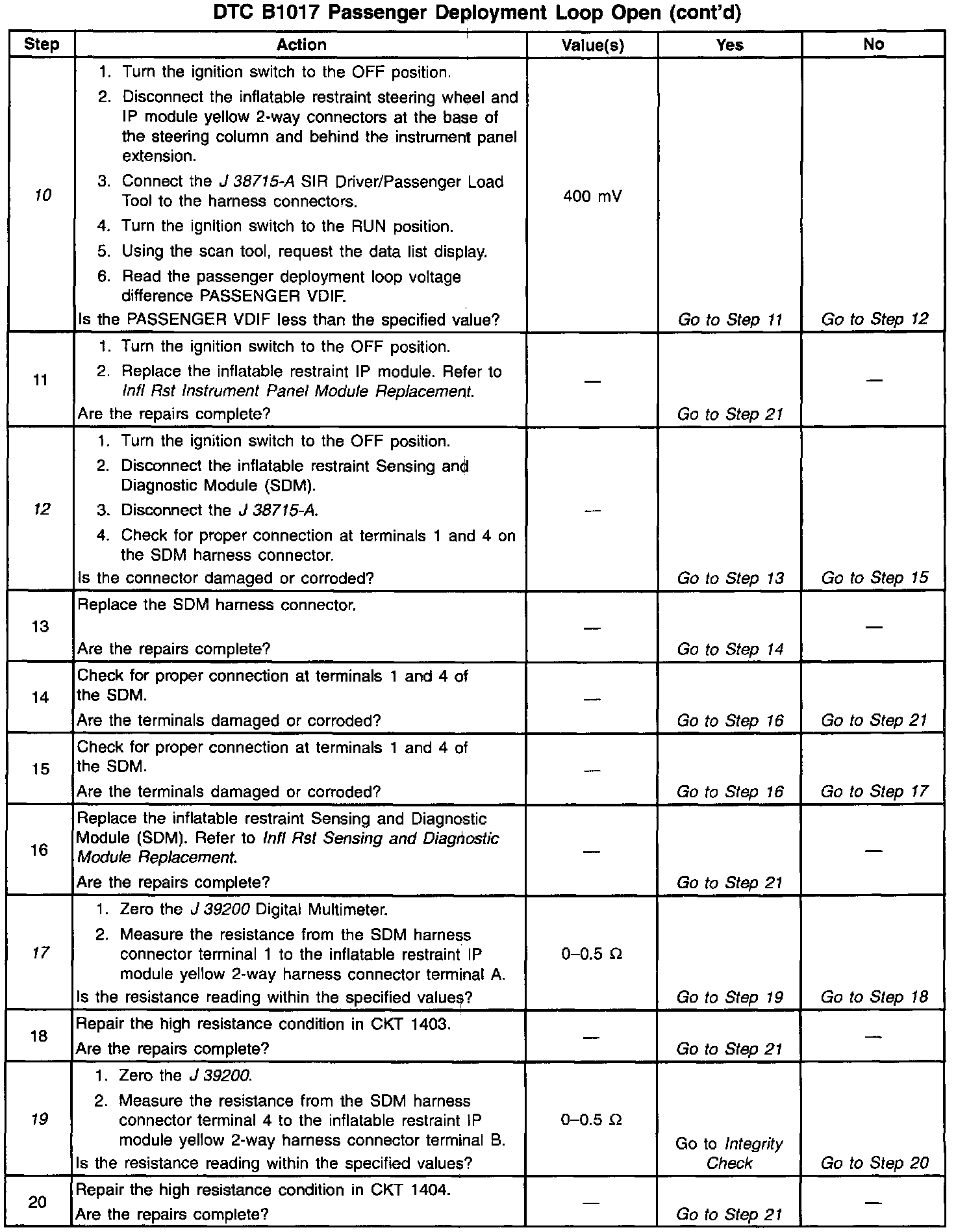 When measurements are requested in this table, use J 39200 Digital Multimeter with the correct terminal adapter from J 35616-A Connector Test Adapter Kit. When a check for proper connection is requested, refer to Intermittents and Poor Connections. Intermittent Problems