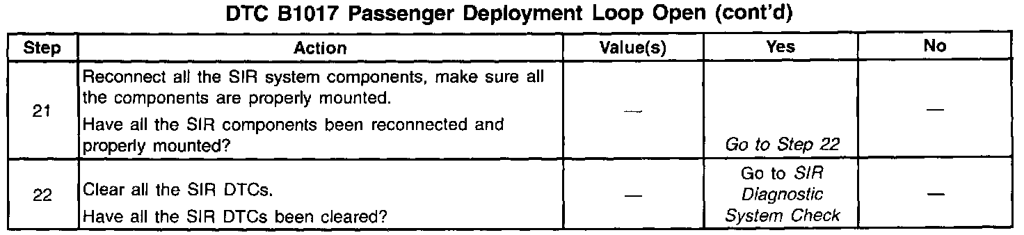 When you first turn the ignition switch to the RUN position, the inflatable restraint Sensing and Diagnostic Module (SDM) performs tests to diagnose critical malfunctions within itself. Next the SDM measures IGNITION 1 voltage to make sure it is within its respective normal voltage range. Then the SDM proceeds with the DEPLOYMENT LOOP CONTINUITY test. During the DEPLOYMENT LOOP CONTINUITY test, the SDM measures the voltage difference between PASSENGER SIDE HIGH and PASSENGER SIDE LOW.