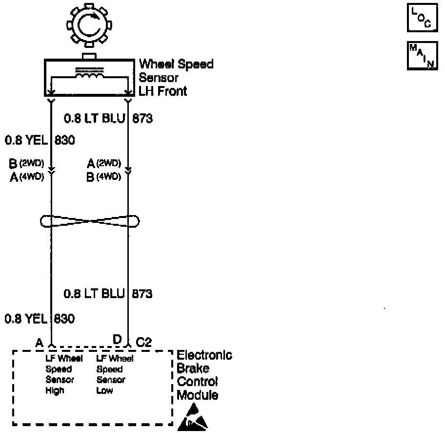 The wheel speed sensor coil emits an electromagnetic field. A toothed ring on the wheel passes by the wheel speed sensor and disrupts this electromagnetic field. The disruption in the field causes the wheel speed sensor to produce a sinusoidal (AC) voltage signal. The frequency and amplitude of the sinusoidal (AC) voltage signal are proportional to the speed of the wheel. The amplitude of the wheel speed signal is also directly related to the distance between the wheel speed sensor coil and the toothed ring. This distance is referred to as the air gap.