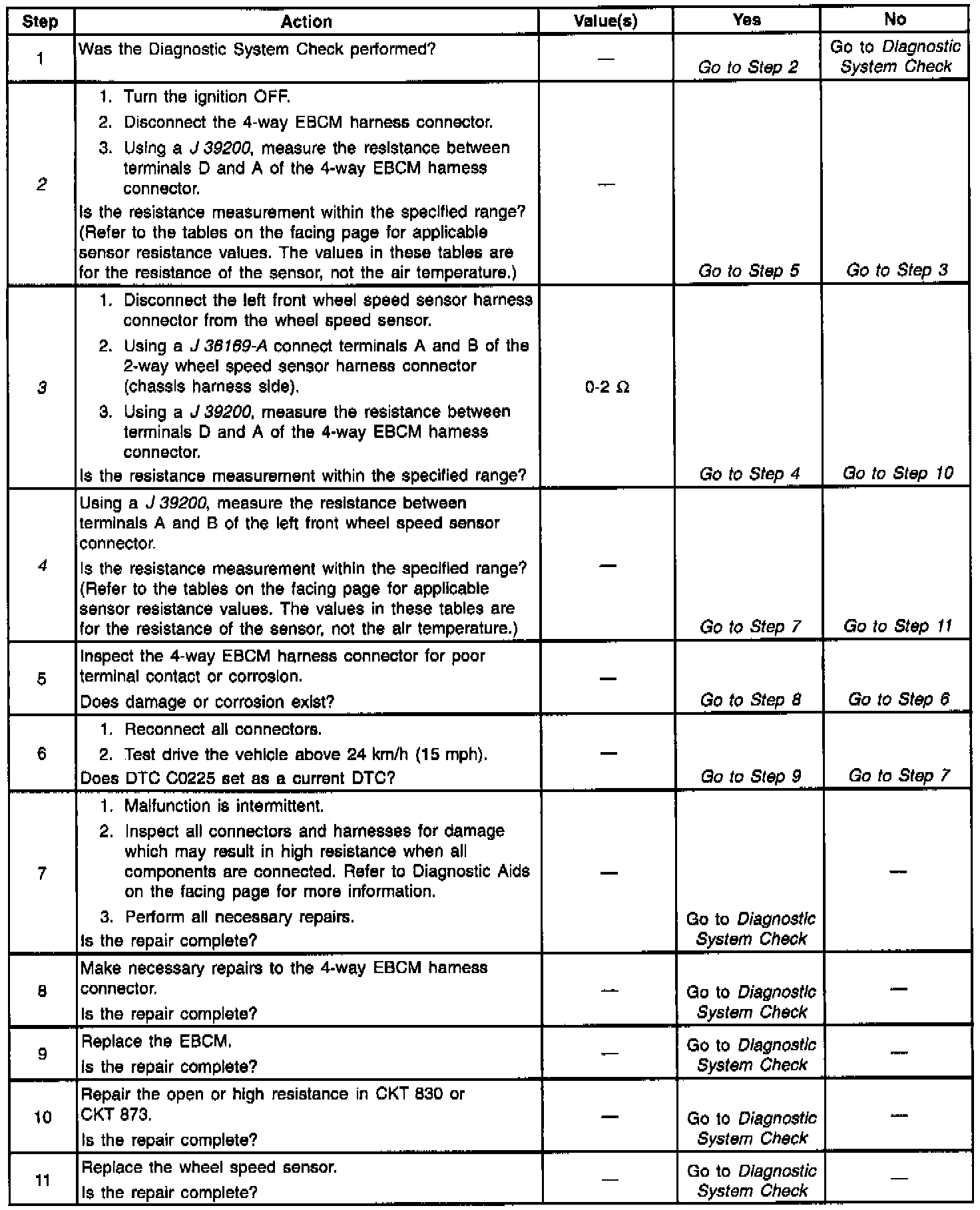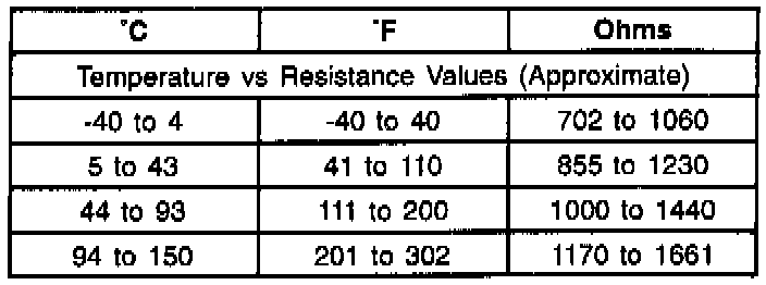 Resistance of the wheel speed sensor will increase with an increase in sensor temperature. Refer to the following for temperature/resistance values.