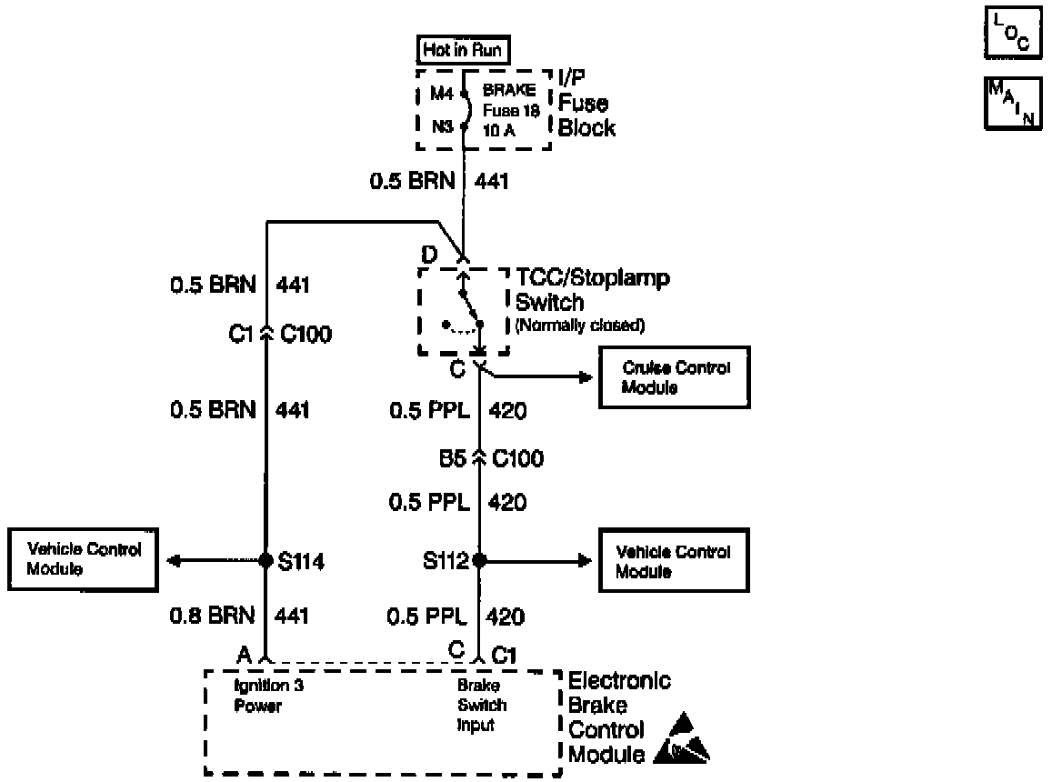 The Stop Lamp Switch is normally closed. With the ignition in the RUN position and the brake pedal not depressed, the Electronic Brake Control Module (EBCM) will have ignition voltage present at terminal C of the 10-way connector. When the brakes are applied, the ignition voltage present at the EBCM will be zero.
