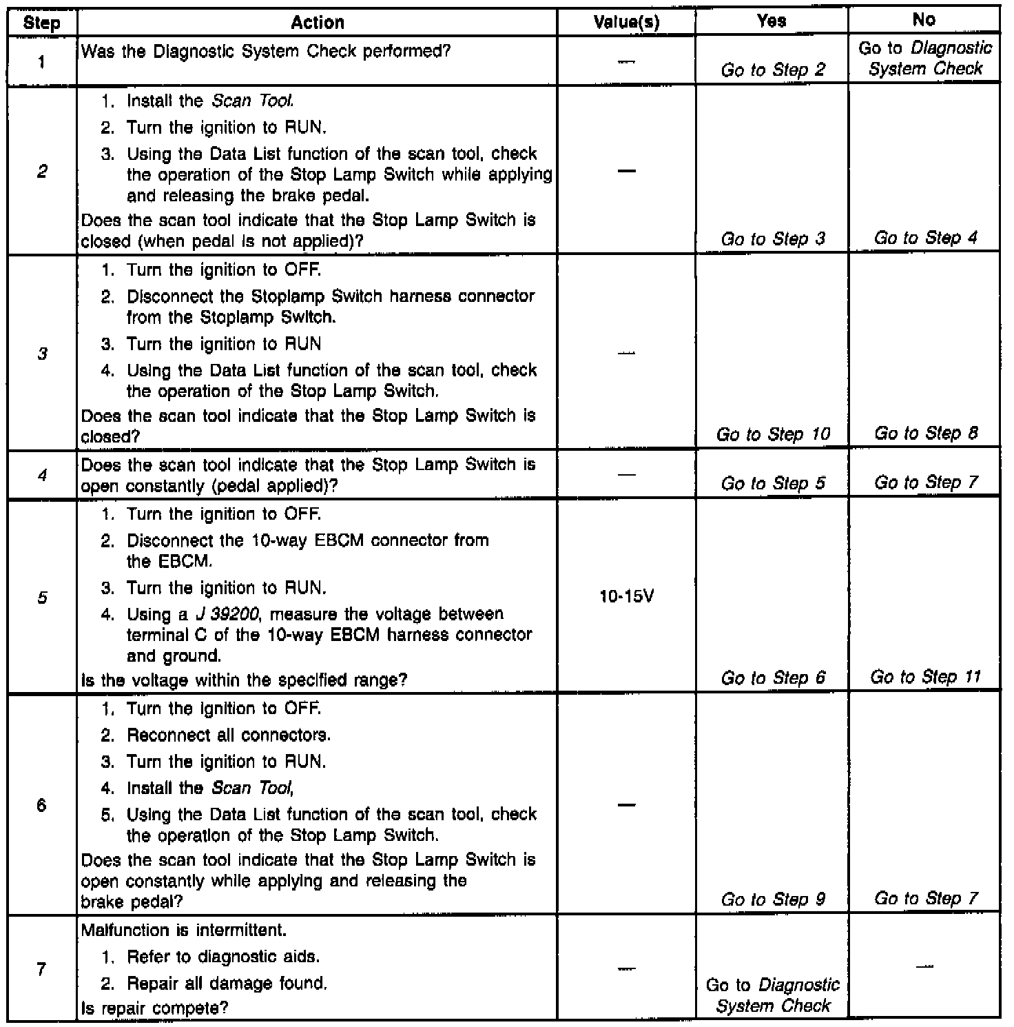 5. This step checks for an open in the Stop Lamp Switch circuit between the Stoplamp Switch and the EBCM.